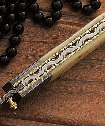 Hand-Forged Damascus Folding Pocket Knife – Genuine Bone Handle EDC with Leather Sheath