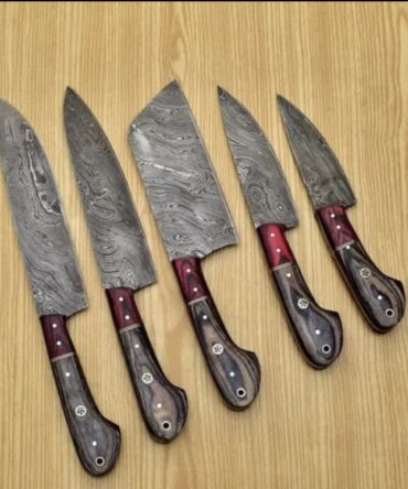 5-Piece Hand Forged Damascus Steel Kitchen Knife Set with Leather Roll Bag