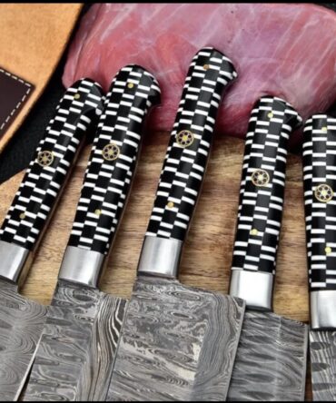 5-Piece Hand Forged Damascus Steel Kitchen Knife Set with Black & White Checkered Resin Handles