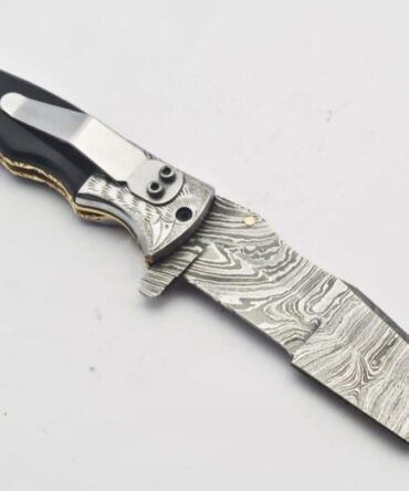 Hand Forged Damascus Steel Folding Knife with Black Micarta Handle & Leather Sheath