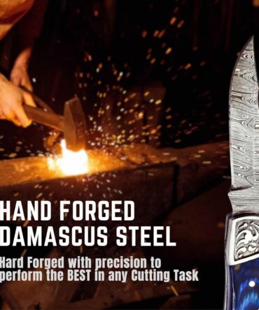 Premium Damascus Back Lock Folding Knife – Blue Pakka Wood Handle & Engraved Bolster