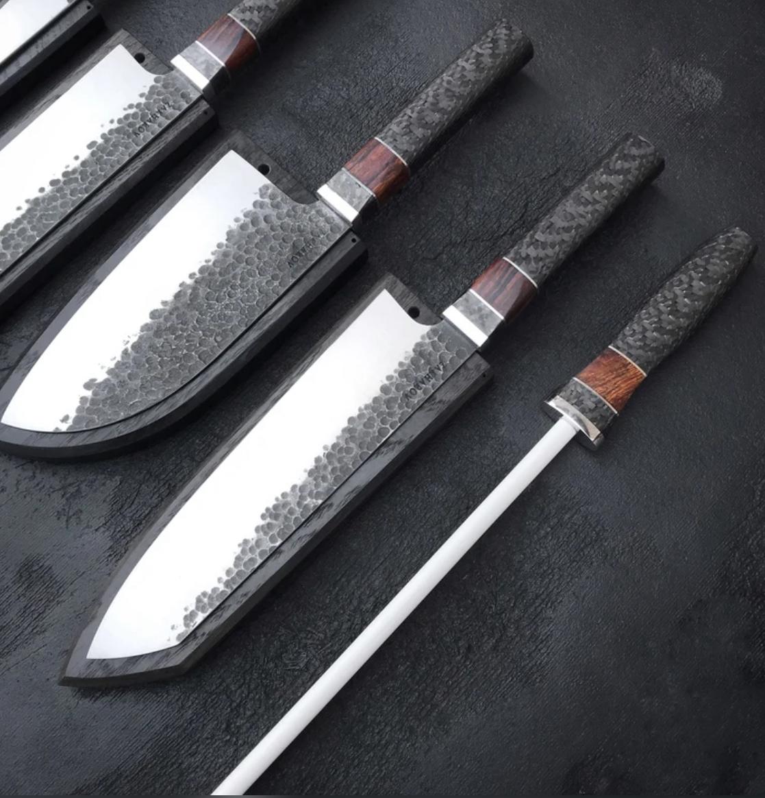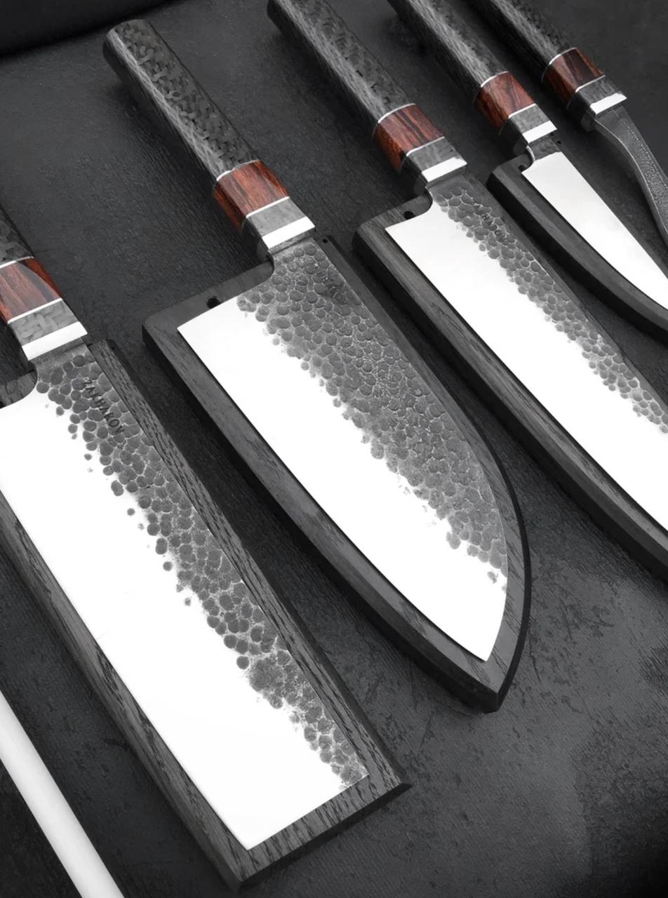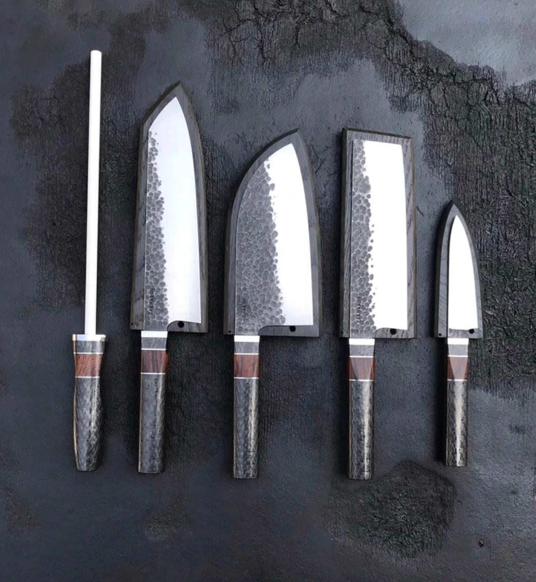 The Blades: High-Performance D2 Tool Steel The blades are individually hand-forged from robust D2 Tool Steel. D2 is a high-carbon, high-chromium tool steel favored by custom knifemakers for its excellent wear resistance and ability to hold a razor-sharp edge longer than many conventional kitchen steels. The blades feature a rustic, forge-finished look, celebrating their handcrafted origin.