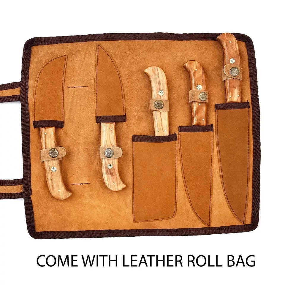 Each knife handle is crafted with ergonomic Olive wood, secured with mosaic brass pins for a comfortable, stylish, and sturdy grip. The set comes with a premium leather roll bag for safe storage and portability.