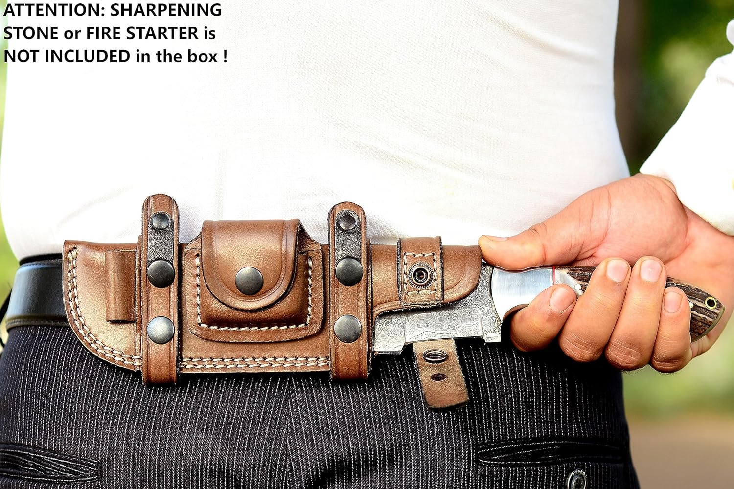 The Sheath: Custom Leather Carry System This knife comes with a high-quality, handcrafted brown leather sheath. The sturdy sheath is designed for secure, multi-position carrying and includes practical features like an accessory pouch (as seen in the image) for a fire starter or sharpener, ensuring you are always prepared.