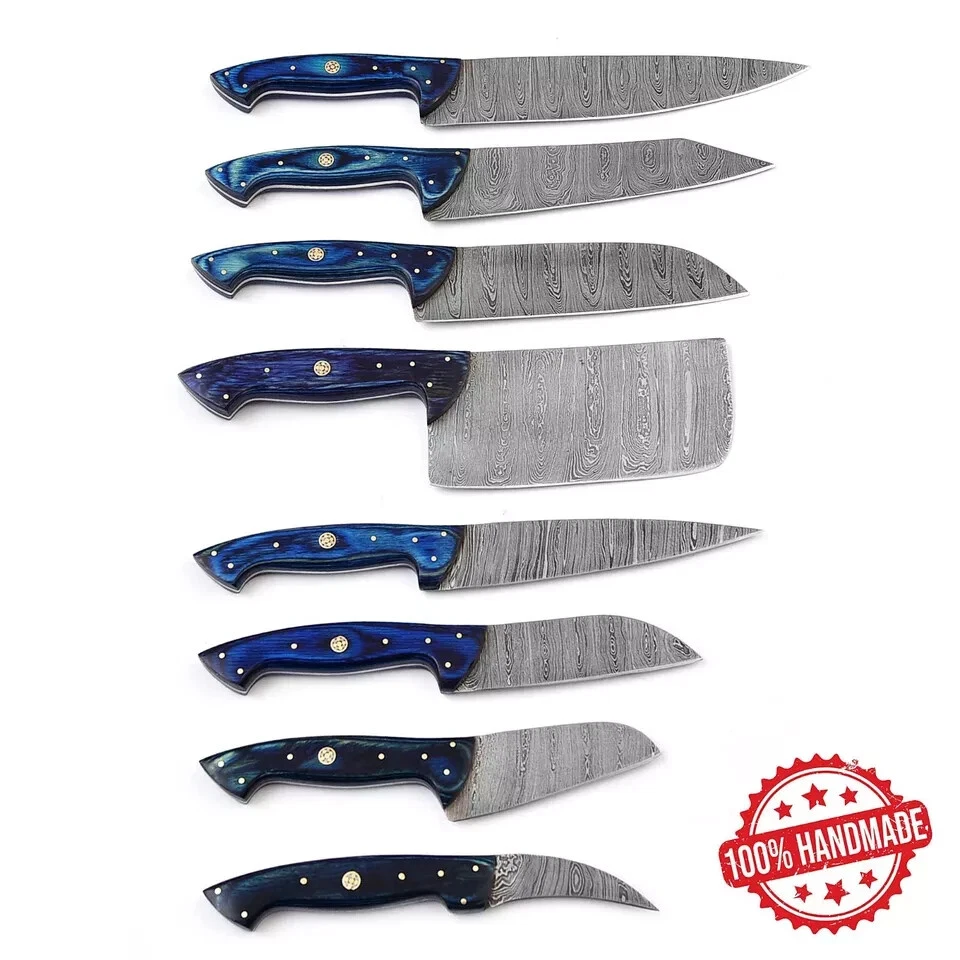 Professional Kitchen Knives Custom Made Damascus Steel 8 pcs of Professional Utility Chef Kitchen Knife Set with Chopper/Cleaver with leather Case Chef Knife Roll Bag (2910-Blue)