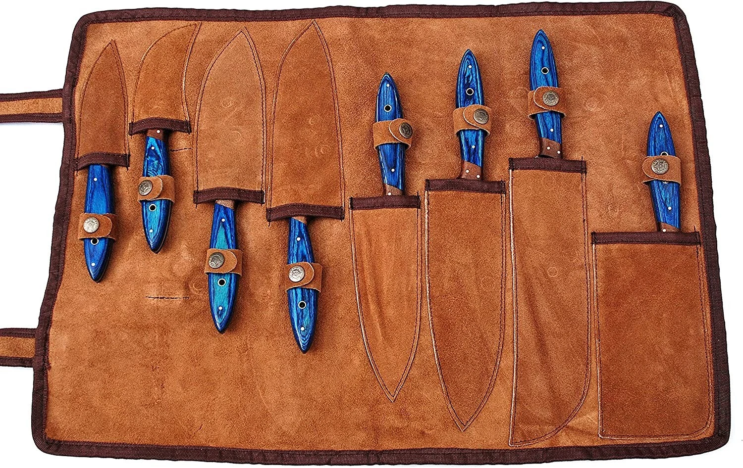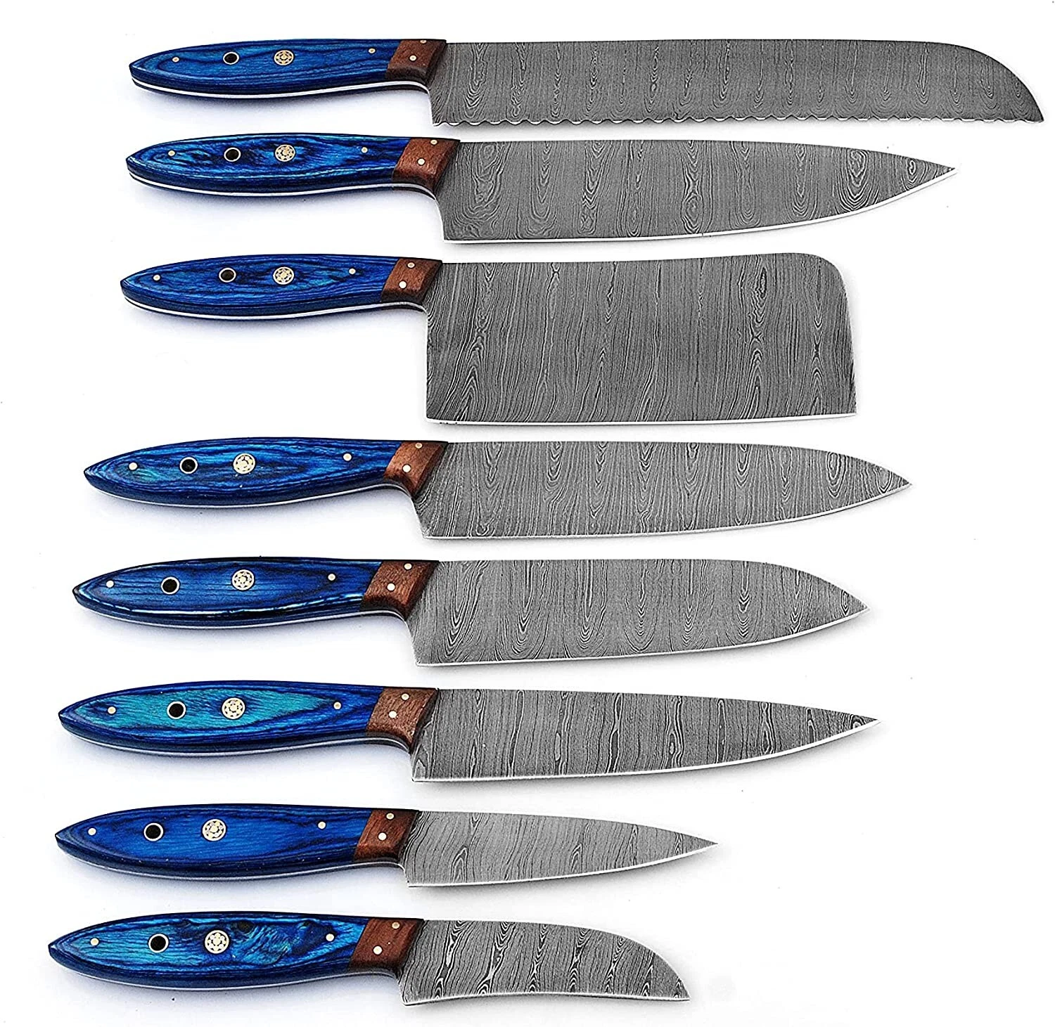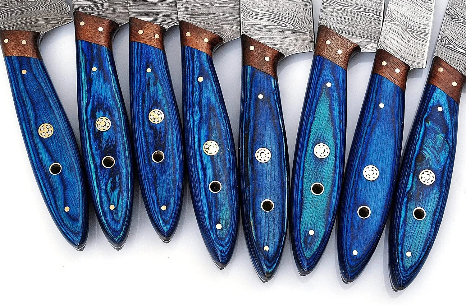 Damascus Steel Professional Kitchen Knife Set, Hand Forge Damascus Chef Knives Set 8 pcs Butcher Cleaver Knives with Leather Case Bag. Blue paukka Wood Handle