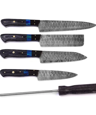 Damascus Chef Knife Set – Premium Wenge Wood Handle with Leather Roll Bag